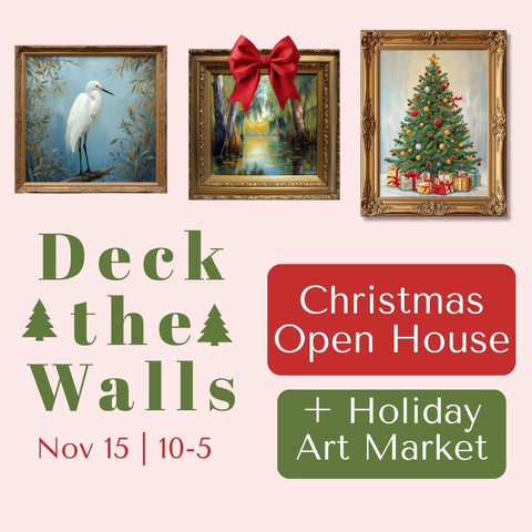 Join us for Deck the Walls, our Christmas Open House featuring an outdoor Holiday Art Market and a first look at brand-new Louisiana Christmas merchandise—oysters, pelicans, fleur-de-lis, bayou vibes, and all the festive goods your stockings can handle.
